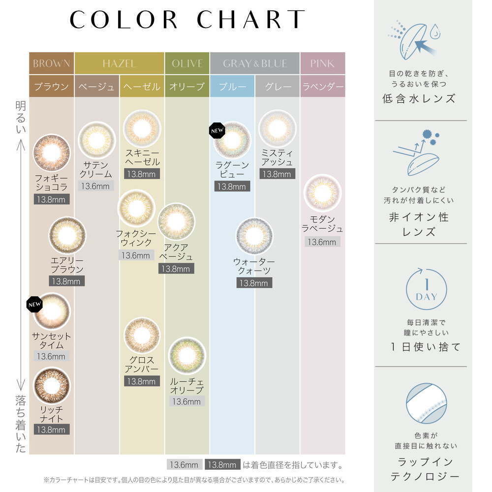 ・着色直径13.8mm:ラグーンビュー/エアリーブラウン/リッチナイト/フォギーショコラ/グロスアンバー/スキニーヘーゼル/ウォータークォーツ/ミスティアッシュ/アクアベージュ