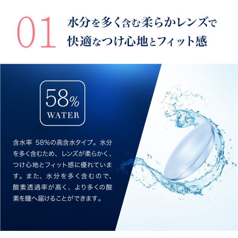 含水率58%に水分を多く含む柔らかレンズで快適なつけ心地とフィット感
